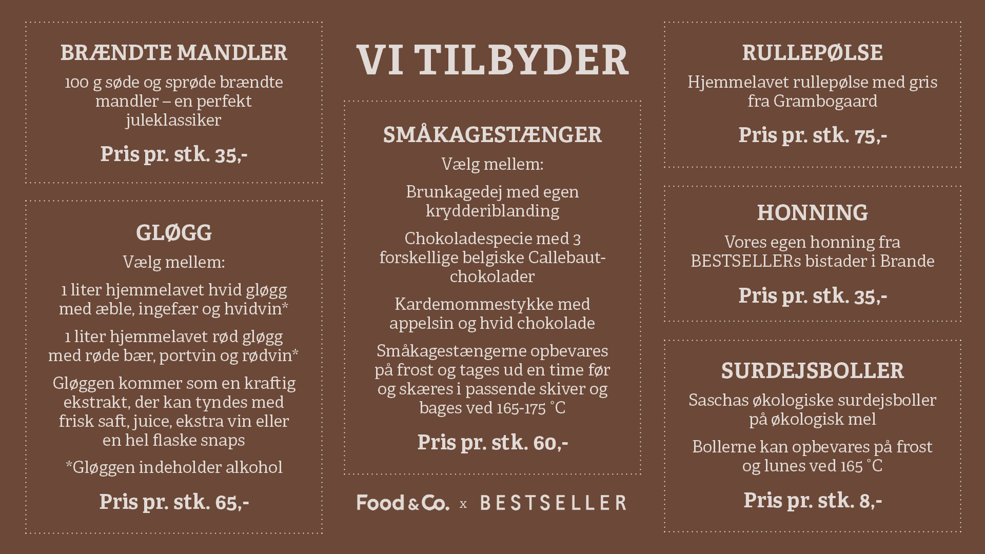 Vi har et bredt udvalg af smagsfulde julelækkerier med til jer. Du kan se udvalget, som du kan forudbestille, nedenfor.