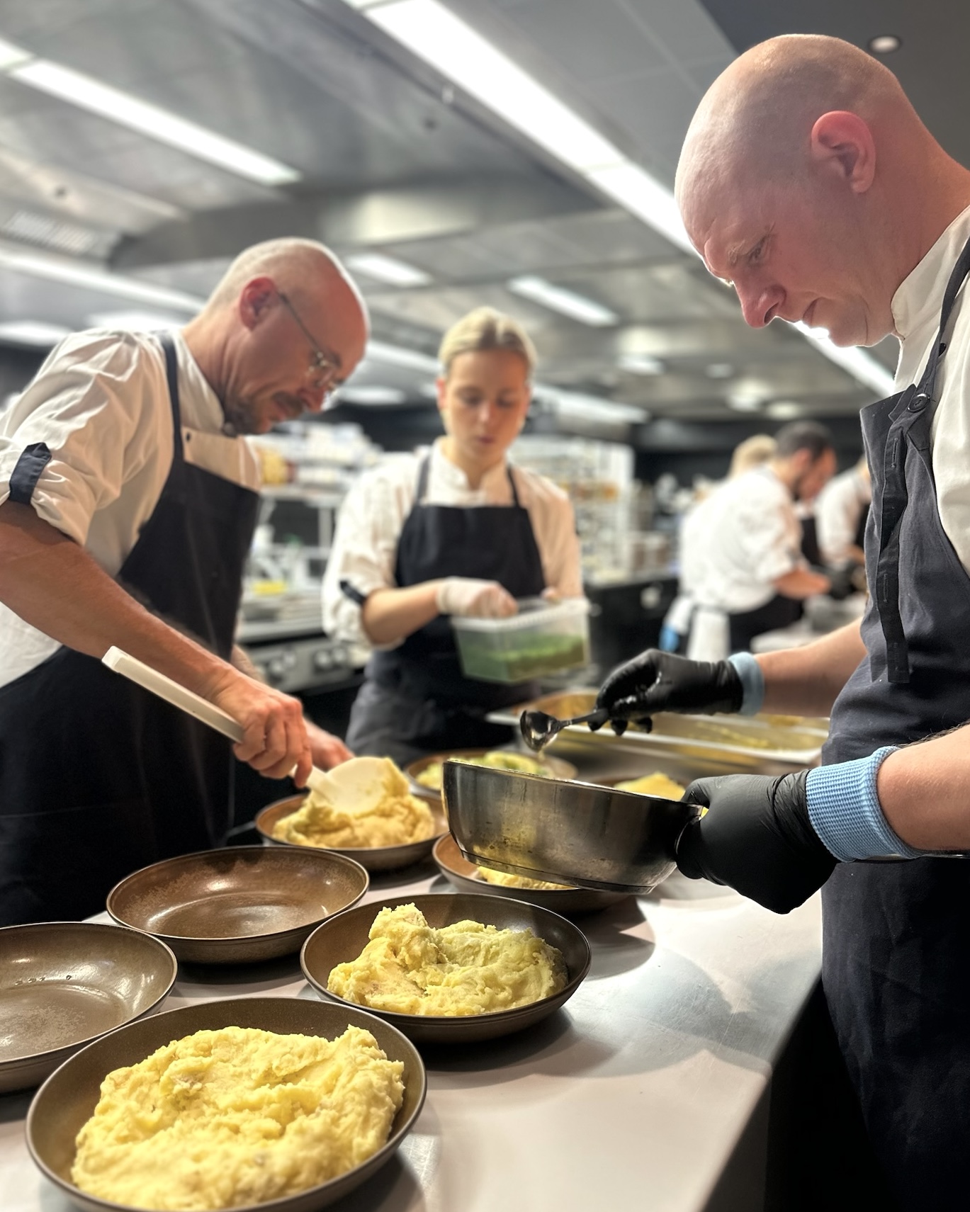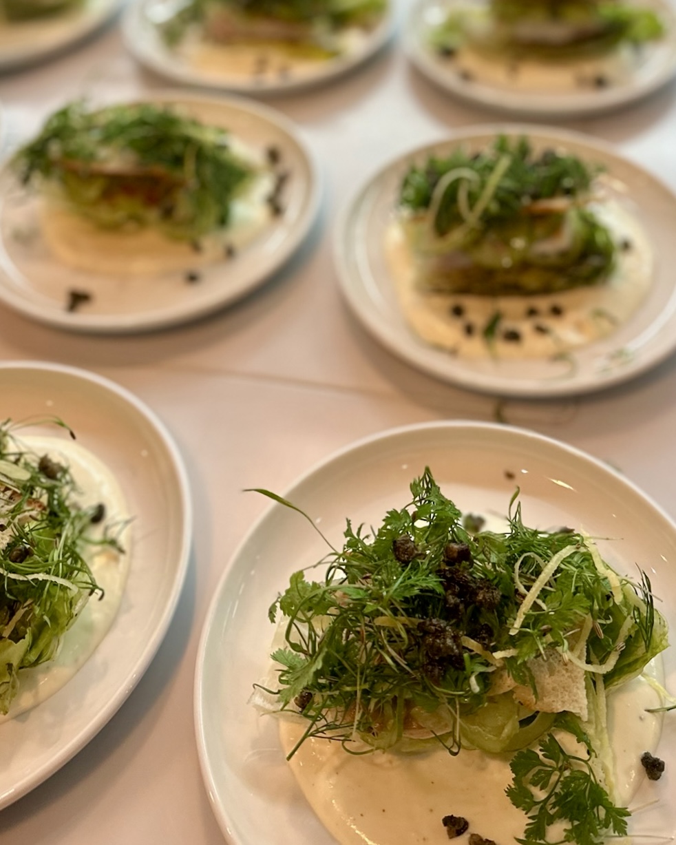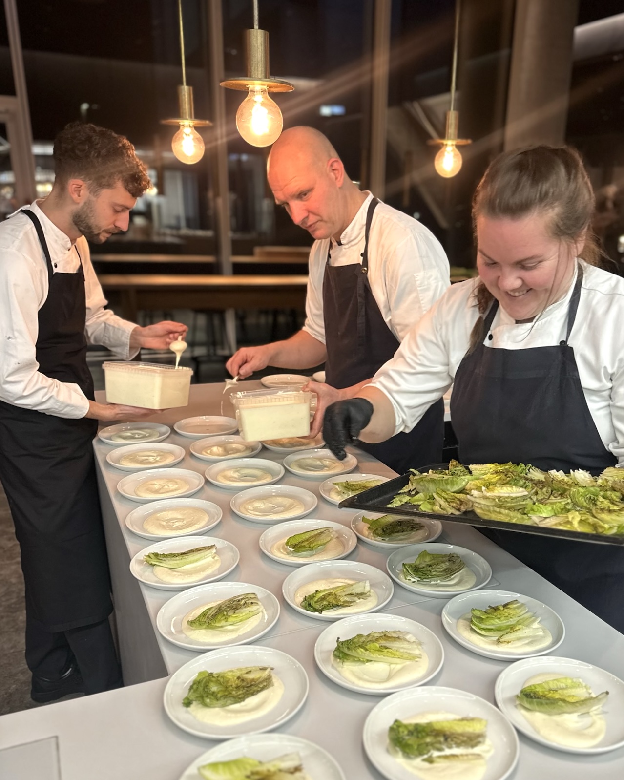 Vi havde tilberedt linetfanget torsk fra Nordsøen fra vores venner hos Havnens Fiskehus med hollandaisecreme, sprød romainesalat og ristet surdejscrumble til forret. Dertil var der focaccia med enebær og pisket brunet smør.