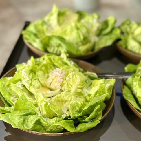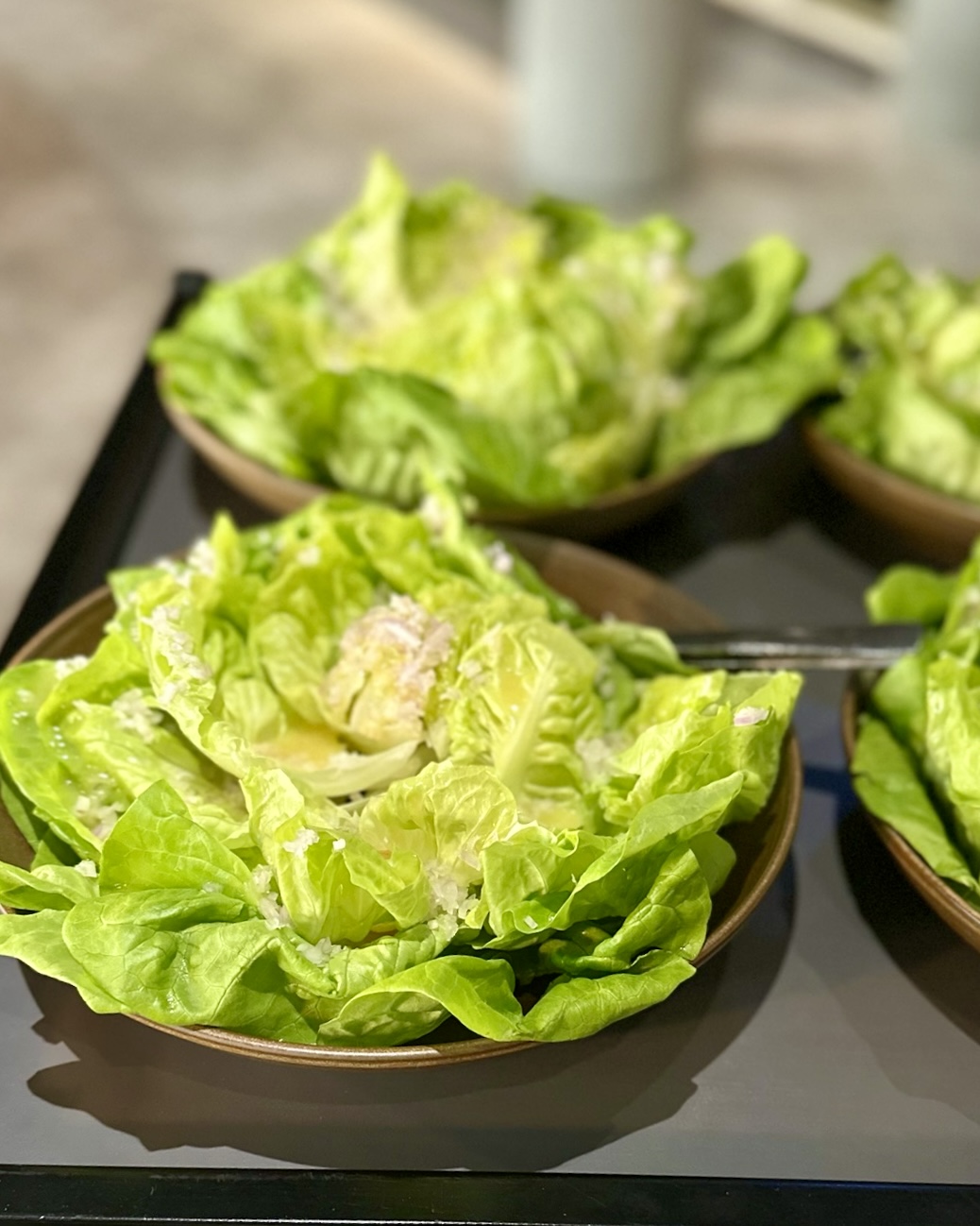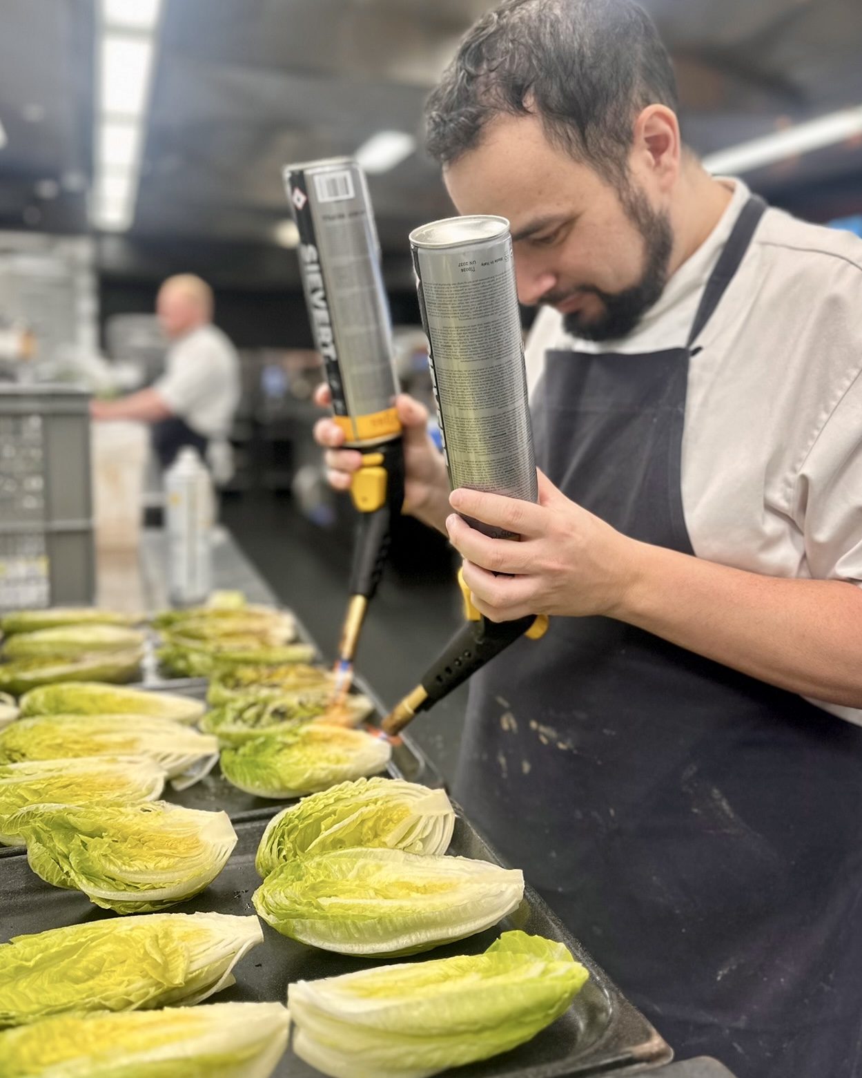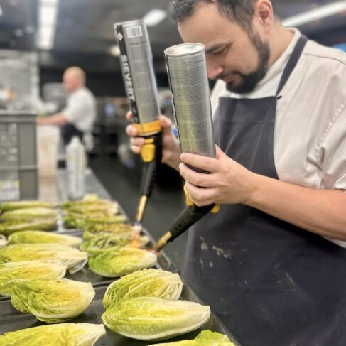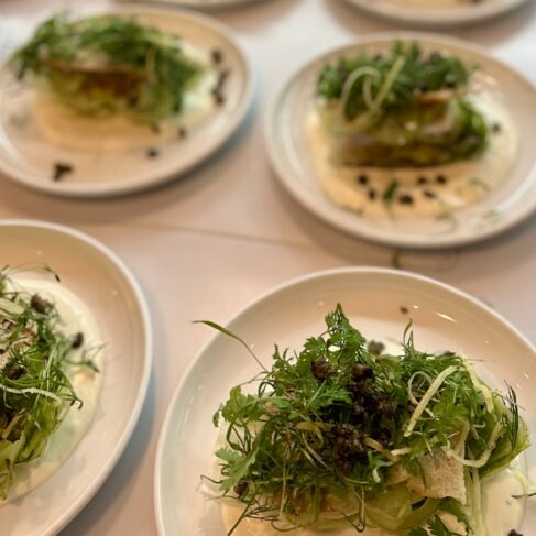 Vi havde tilberedt linetfanget torsk fra Nordsøen fra vores venner hos Havnens Fiskehus med hollandaisecreme, sprød romainesalat og ristet surdejscrumble til forret. Dertil var der focaccia med enebær og pisket brunet smør.