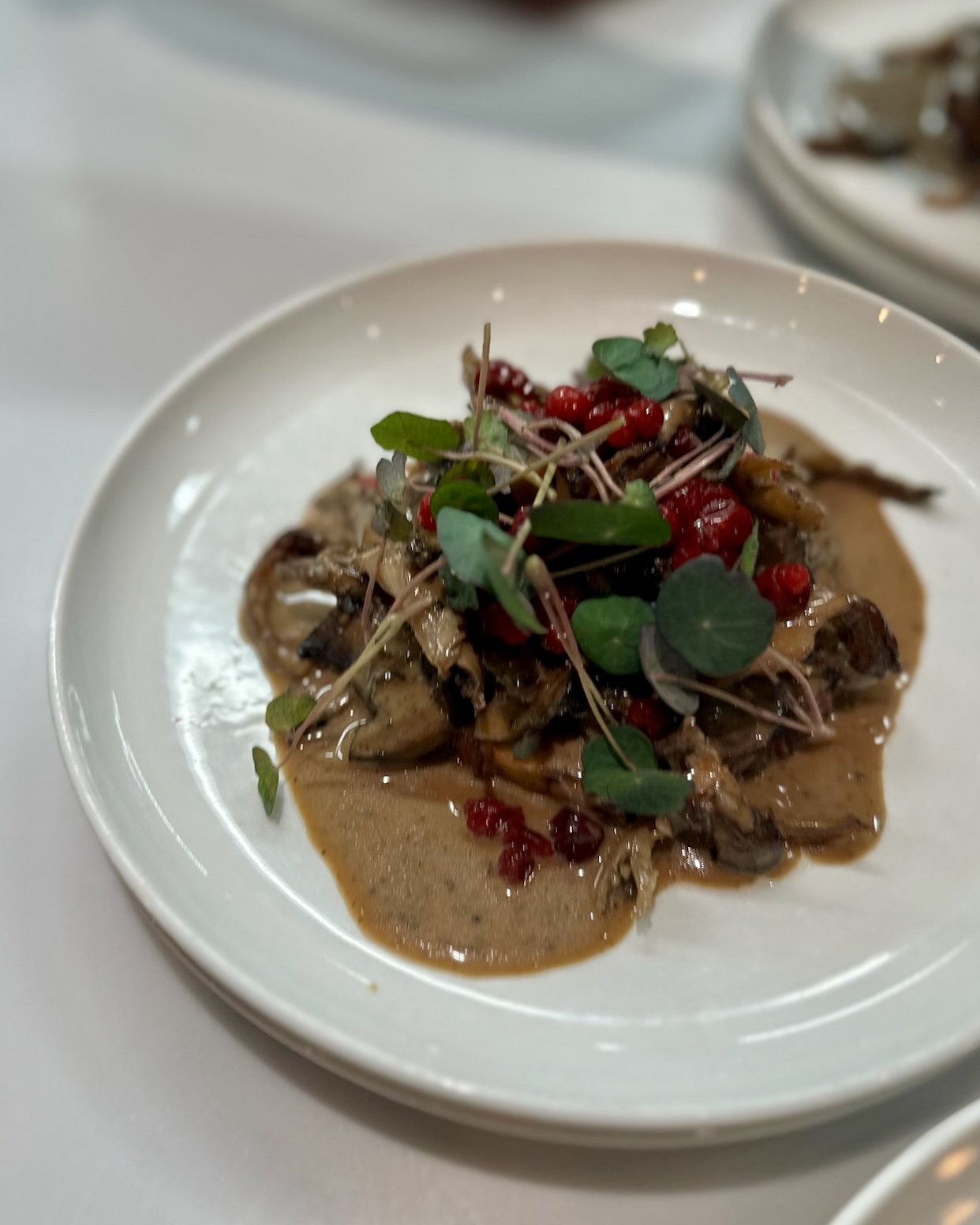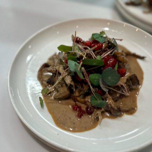 Hovedretten bestod af langtidsstegt dansk knoldselleri, skovsvampe-fumet og sankede novemberbær sammen med knuste kartofler rørt med økologisk smør samt sæsonens grønt med let vinaigrette.