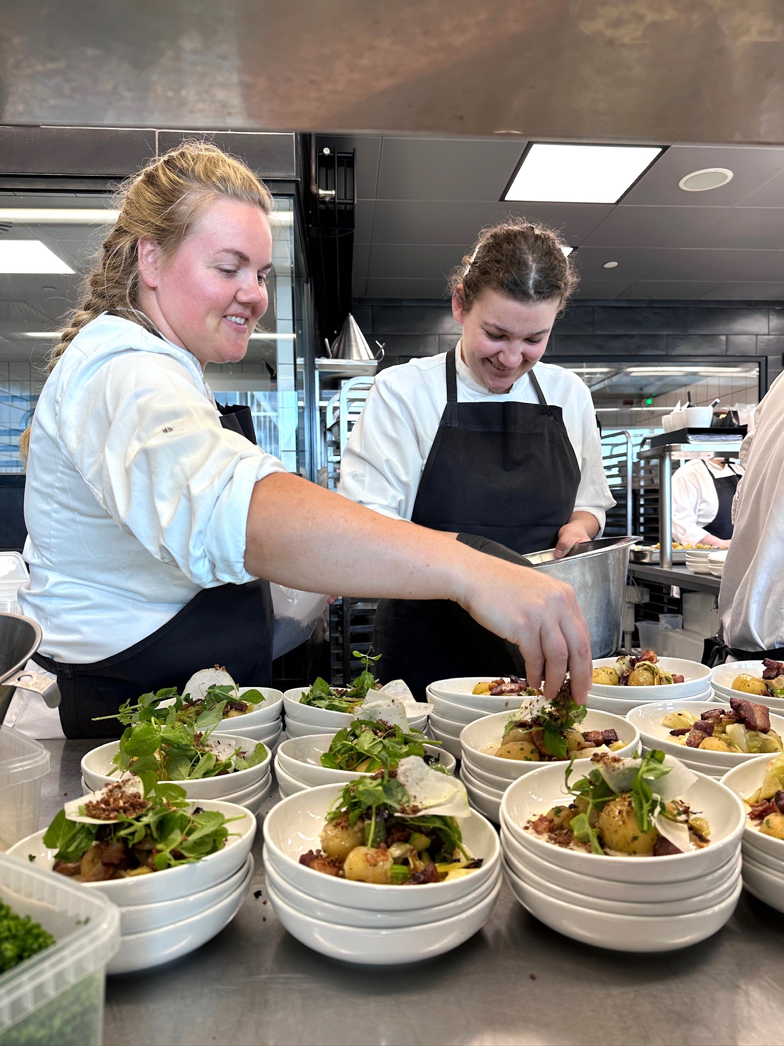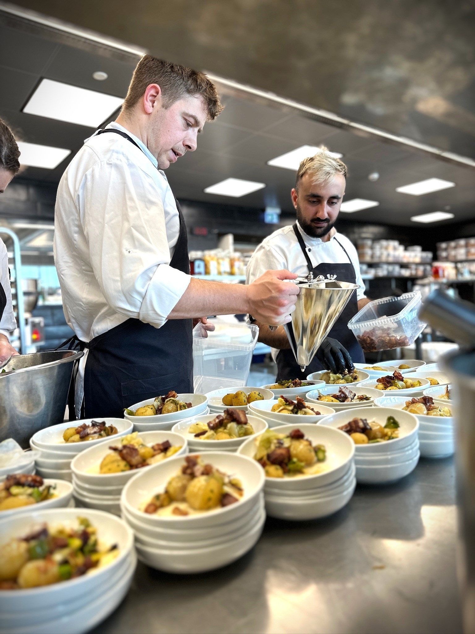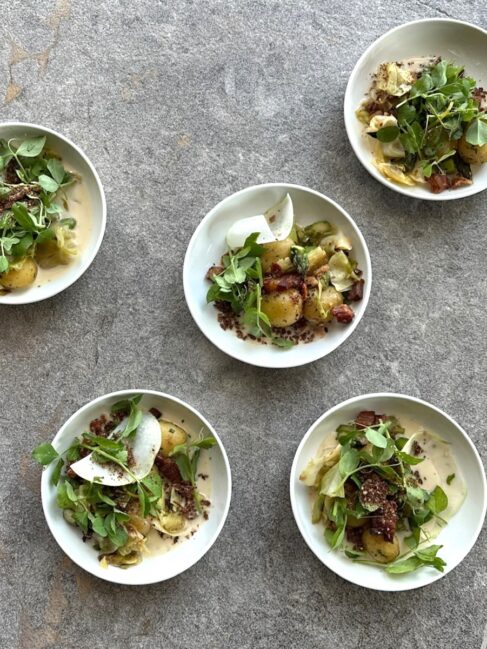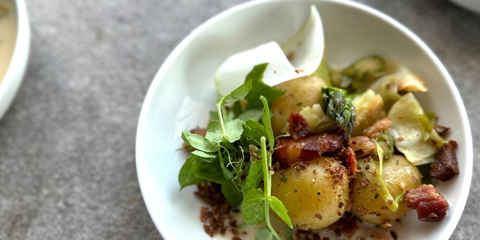 Nyopgravede danske kartofler, og sæsonens sidste asparges fik lov at spille hovedrollen, ledsaget af sprød velfærdsbacon fra Grambogård – kendt for deres høje dyrevelfærd, gennemsigtighed og kvalitet.