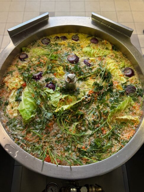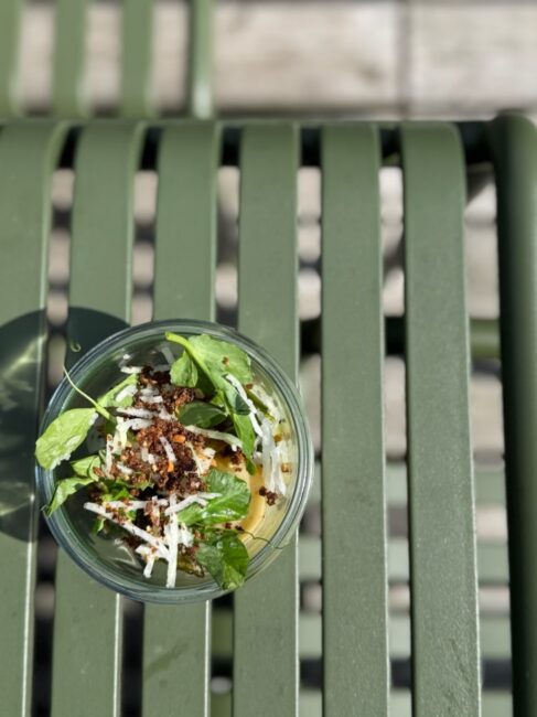 Retten blev løftet med sauce baseret på hjemmekogt fond og produkter fra nocla – dem havde vi for nylig besøgt, og smagt deres fermenterede smagsgivere baseret på korn og bælgfrugter. Vi kalder deres “fonder” umamifond, fordi de er smækfyldt med umami og mundfylde, og fordi de giver det grønnere måltid karakter og dybde.