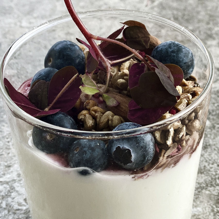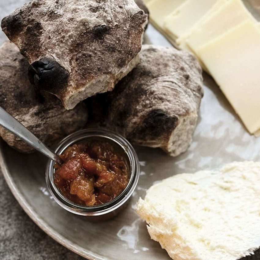 Homemade sourdough bread, cold cuts, cheese, jam, Skyr w/ Granola & Juice