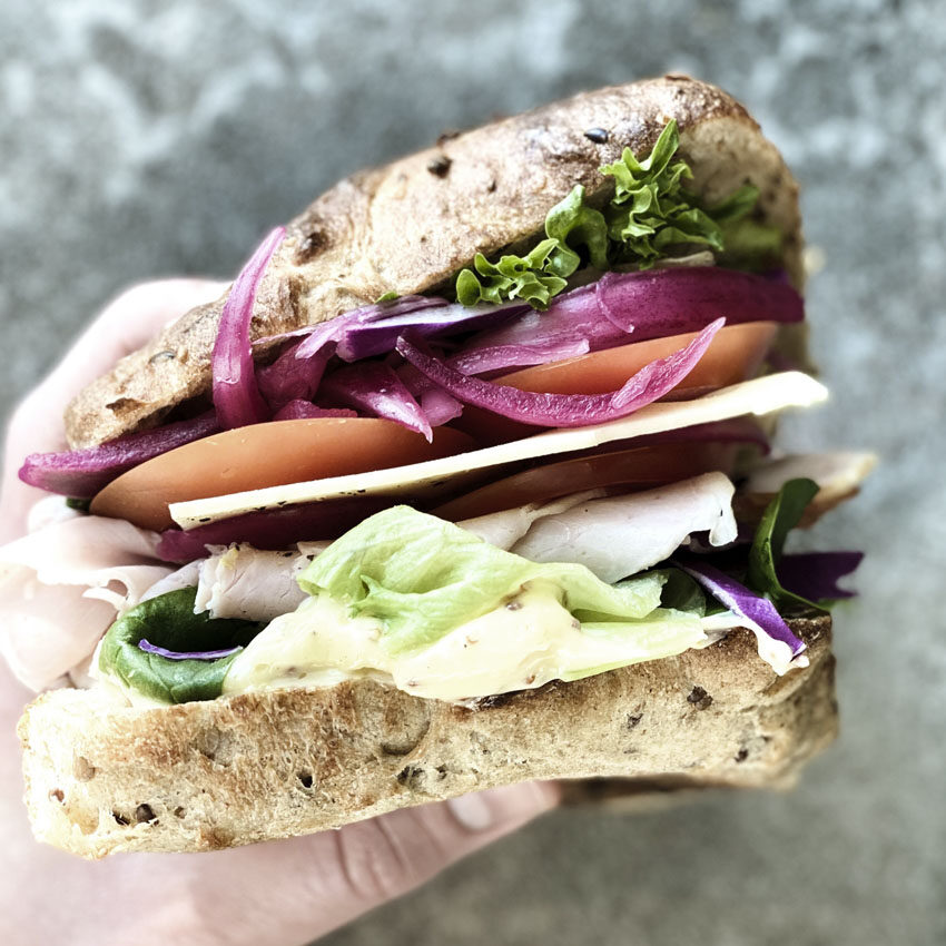 Homemade sourdough bread, cold cuts, cheese, jam skyr w/granola and juice