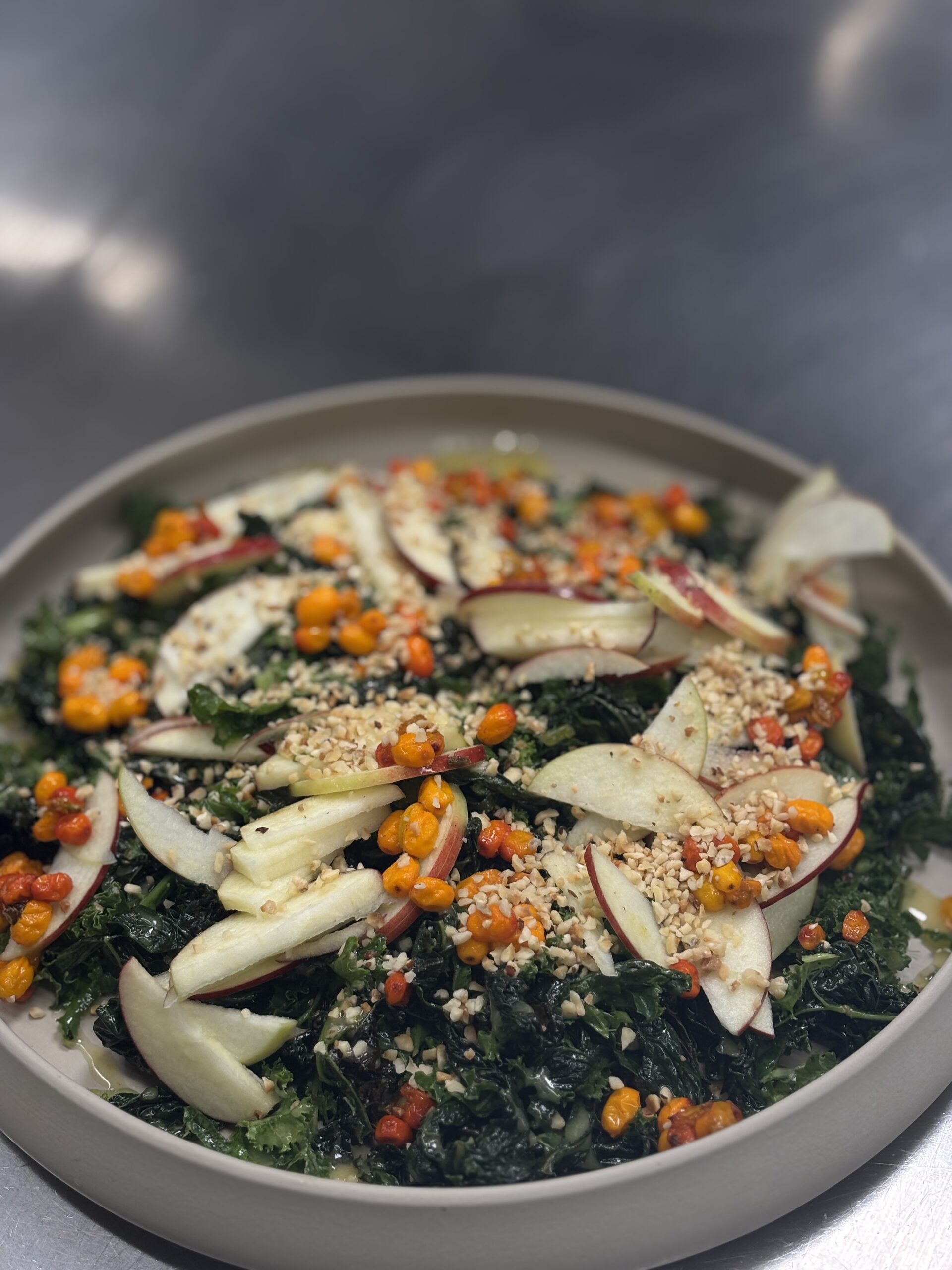 Herefter blev der serveret stegt dansk kylling med svampe og intens timiansauce ledsaget af danske kartofler, økologisk smør og friske krydderurter. Hertil to smagfulde salater: en vintersalat med grønkål, hasselnødder og danske æbler samt en grøn salat med parmesandressing og syltede rødløg.