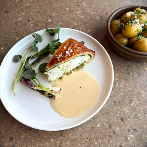 Pithivier med torsk, porre, spinat, hertil en fumé-sauce, grillede løg, og nye kartofler.