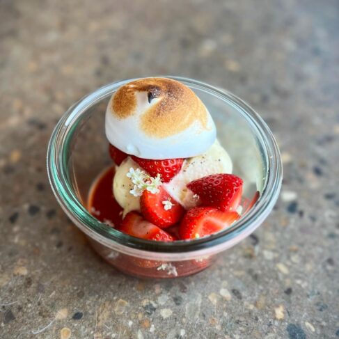 Nye Danske jordbær med blondiekage, hyldeblomst, og brændt marengs.