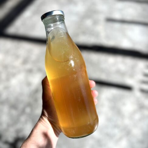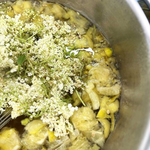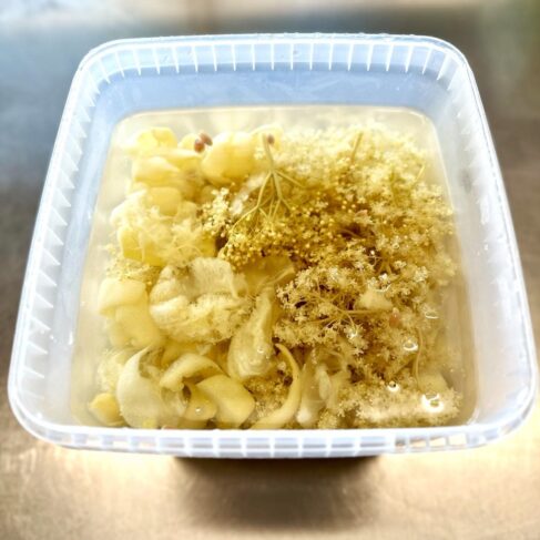 Vi bruger udelukkende økologisk rørsukker, økologiske citroner og egne plukkede hyldeblomstskærme, i dette tilfælde fra Andreas’ nærområde i Beder.