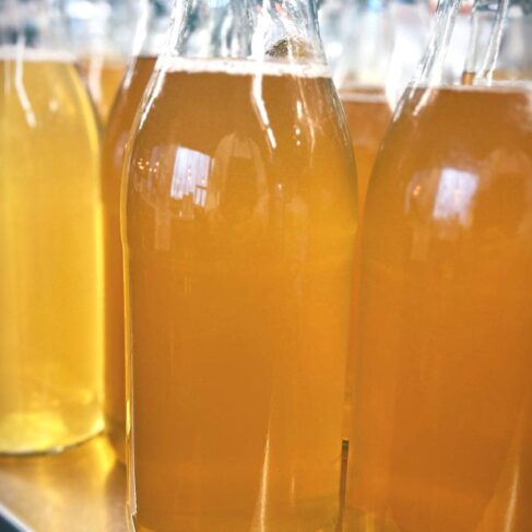 Alt pulp fra denne saftproduktion bruger vi til hyldeblomsteddike som er skøn i dressinger, på salater og ikke mindst i tilsmagning af saucer, til at kunne give et strejf af sommer selv i kolde tider.