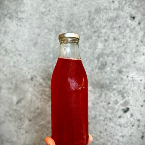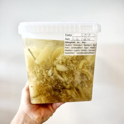 Vi laver ca. 150 liter helt klassisk hyldeblomstsaft som du kender, udover den klassiske laver vi også omkring 70 liter “limited”. – Hvor vi bruger alle toppe og overskudsjordbær fra vores produktion af jordbærtærter.