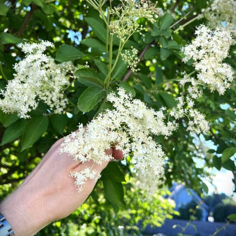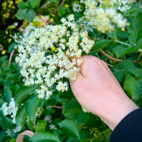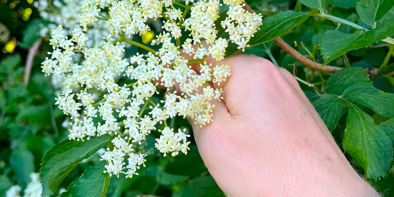 Hver sommer plukker vi masser af friske hyldeblomstskærme som bliver lavet til den skønneste saft.